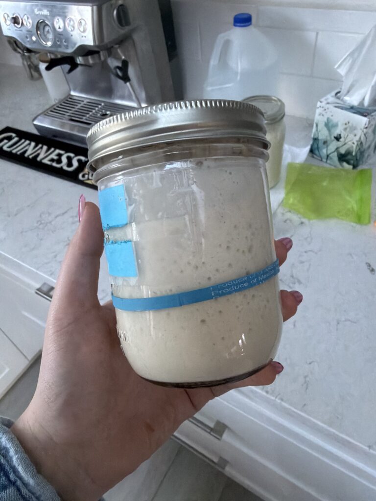 This is how I might explain a sourdough starter to a student, or someone who cannot quite grasp the concept of the fermentation process. Being in this age of technology, I learned most of my knowledge regarding how to make my starter via instagram reels, and TikTok. Initially, I was feeding it a 1:1:1 ratio- this means equal parts starter, water, and flour. Ratios in the beginning is tricky, because when you first make it, it only requires flour, and water.