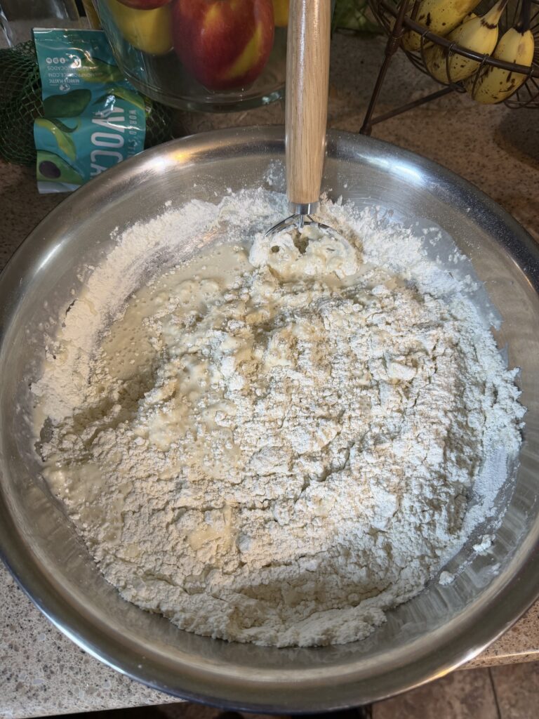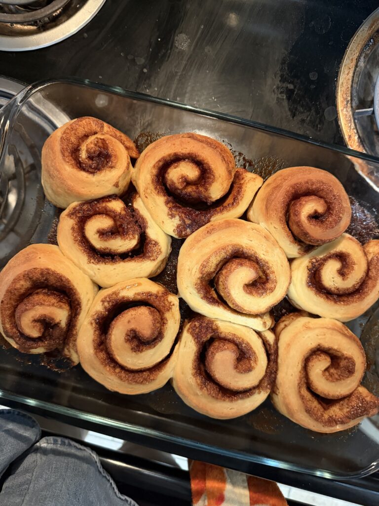 I had never made sourdough cinnamon rolls before, so I was nervous. I knew Noahs roomates and teammates would come and try everything, so I wanted perfection. They rose perfectly on the counter and were so fluffy yet firm. I realised, though, that I forgot to make icing for them- this is where I got creative. I love anything browned-butter, along with maple and brown sugar flavoured. I browned my butter in a pan, then added brown sugar and maple syrup to it. I realized that since the water content had evaporated from the butter, the brown sugar would not break down well, or at all, in the browned butter. I added a little bit of water back into it, which aided in the brown sugar breakdown. I wanted it to still be creamy and thick, like regular icing. I looked in Noah’s fridge and saw a block of cream cheese. I love cream cheese icing, so I figured, “let’s throw this in and see what happens”. The result was a creamy, sweet, browned icing that complemented the rolls perfectly. Noah and his roommates said they could eat easily 5 at a time if they could, as they were not too sweet (which regular white icing usually is). I now know how to make this perfect icing, without having to look up a recipe!